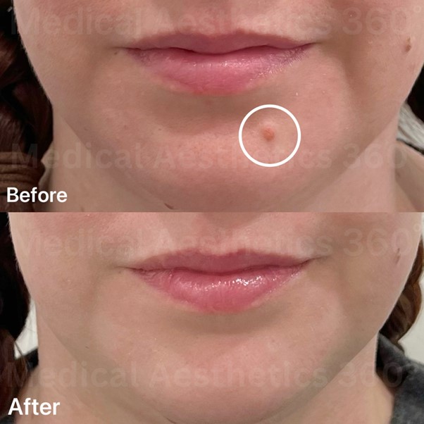 Story This patient came to Medical Aesthetics 360° feeling self-conscious about a raised mole on her chin. The bumpy texture often rubbed against clothing and