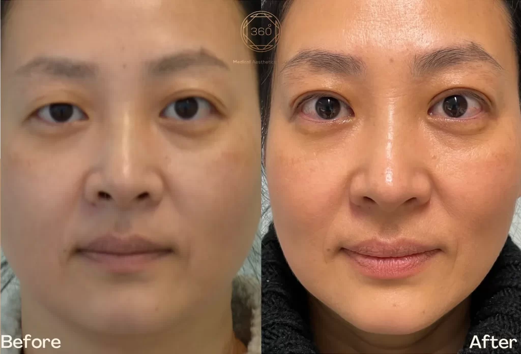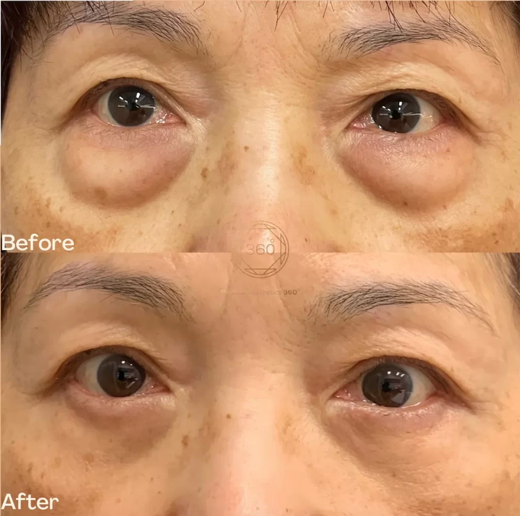 Her main goal was not to look different, but to soften the puffy under-eye appearance and achieve a fresher, more balanced look. During consultation, the focus was on improving the prominence of the under-eye bags while preserving her natural facial expression and respecting her age and features. A tailored treatment plan was designed to smooth the lower eyelid area and create a more refreshed appearance.