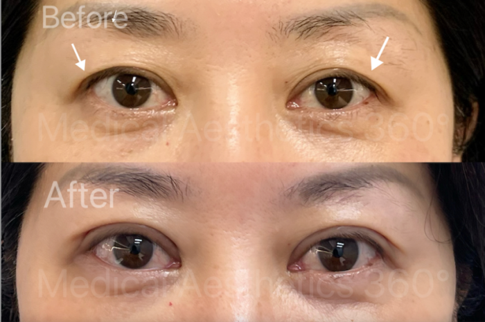 This patient had started to notice over the past two years that her upper eyelids looked heavier and more hooded than before. The change was gradual, but enough to make her eyes appear smaller, more tired and less defined. She felt that her eyes no longer looked as fresh or open, and even simple eye makeup became harder to apply neatly.