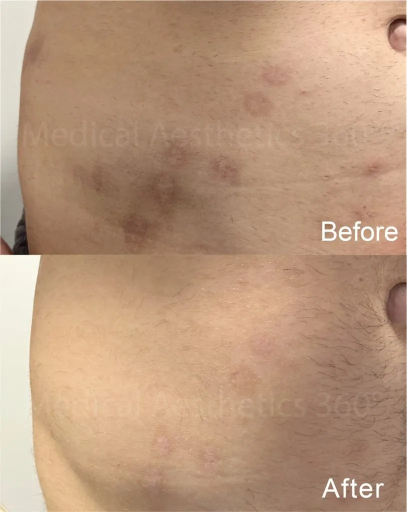 This patient visited Medical Aesthetics 360° after a kitchen accident left multiple oil-splash marks on his abdomen. Though the burns had healed, the area developed visible dark spots and uneven skin tone, which became more noticeable over time. The scars not only affected the appearance of his skin but also made him self-conscious during daily activities and exercise.