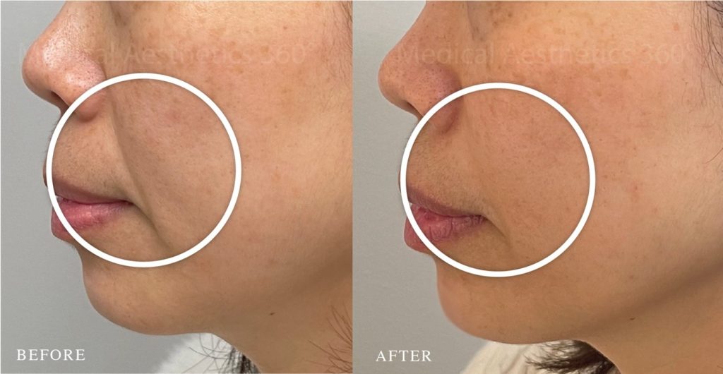 This patient visited Medical Aesthetics 360° with concerns about visible signs of ageing, particularly the deepening of her nasolabial folds (smile lines). Over time, natural collagen loss and changes in facial support had caused the smile lines to become more prominent, affecting her overall facial harmony and making her appearance look more tired than she felt.